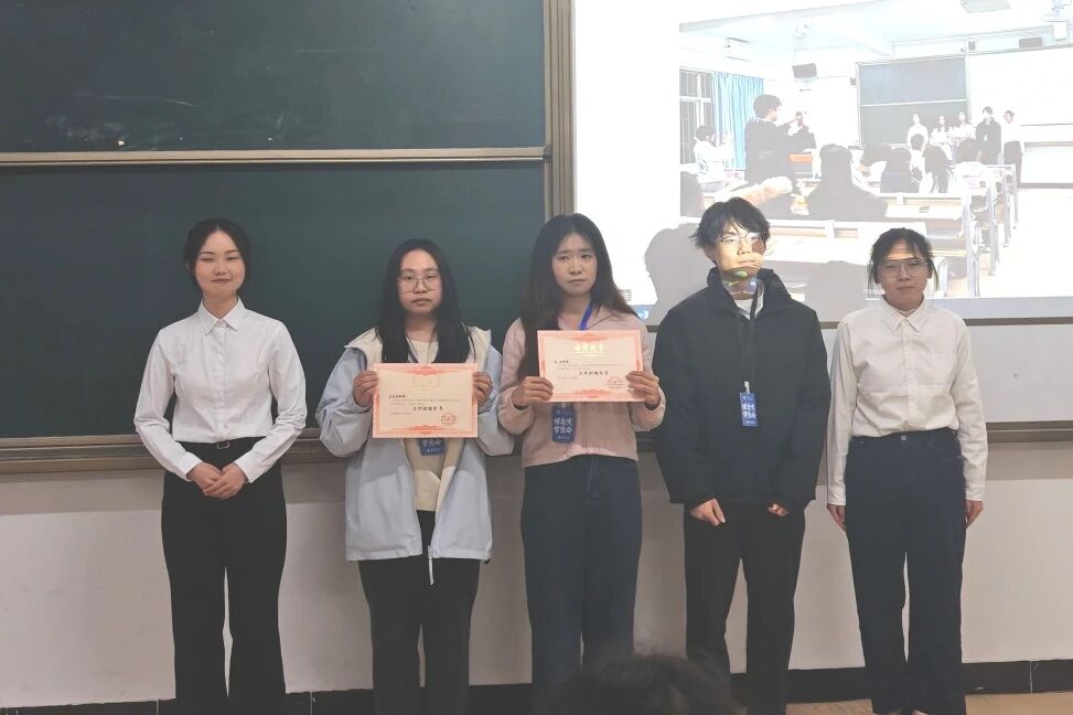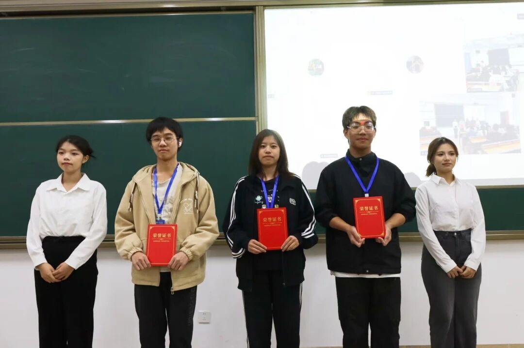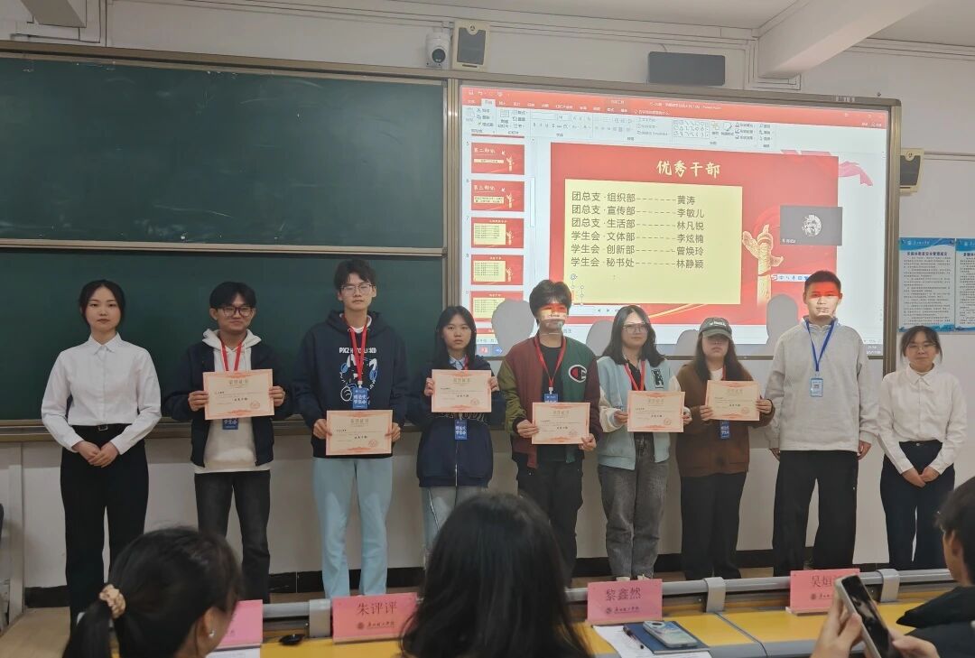 在隆重的表彰环节,黎鑫然老师与吴烜鸿、朱评评、陈垚泠同学为2025-2026学年第一学期的“工作积极分子”“优秀干事”“优秀干部”及“先进部门”颁发了荣誉证书。