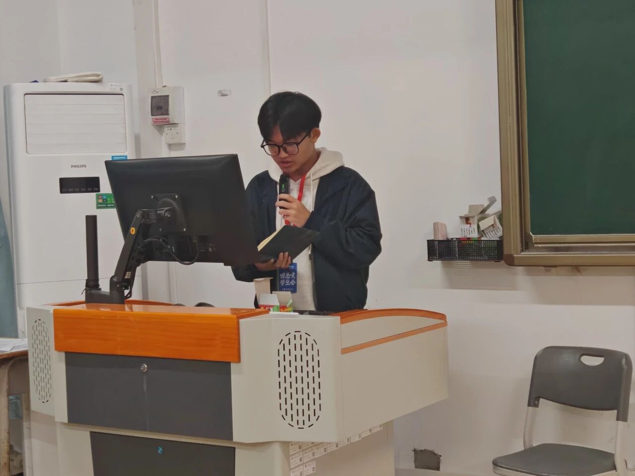 最后,人工智能学院团总支书记黎鑫然为大会作总结讲话。他高度肯定了团学组织在过去一年中取得的丰硕成果和长足进步,对全体成员的辛勤努力与无私奉献表示衷心感谢。讲话中,黎老师特地分享了“网红第一书记”董桂林的感人故事。他提到,董桂林在驻村期间,为拉近与群众距离、摸清每家每户实情,自创“蹭饭工作法”——自带碗筷,主动到老乡家“蹭饭”,在饭桌上听真话、解难题;短短半年,走遍全村196户,记下3大本“民情日记”,帮助销售滞销农产品超40万元,被村民亲切地称为“蹭饭书记”。黎老师借题勉励——“蹭的是饭,暖的是心,赢的是信任”,号召团学骨干把办公室搬到同学中间,用脚步丈量责任,用真情交换真心。