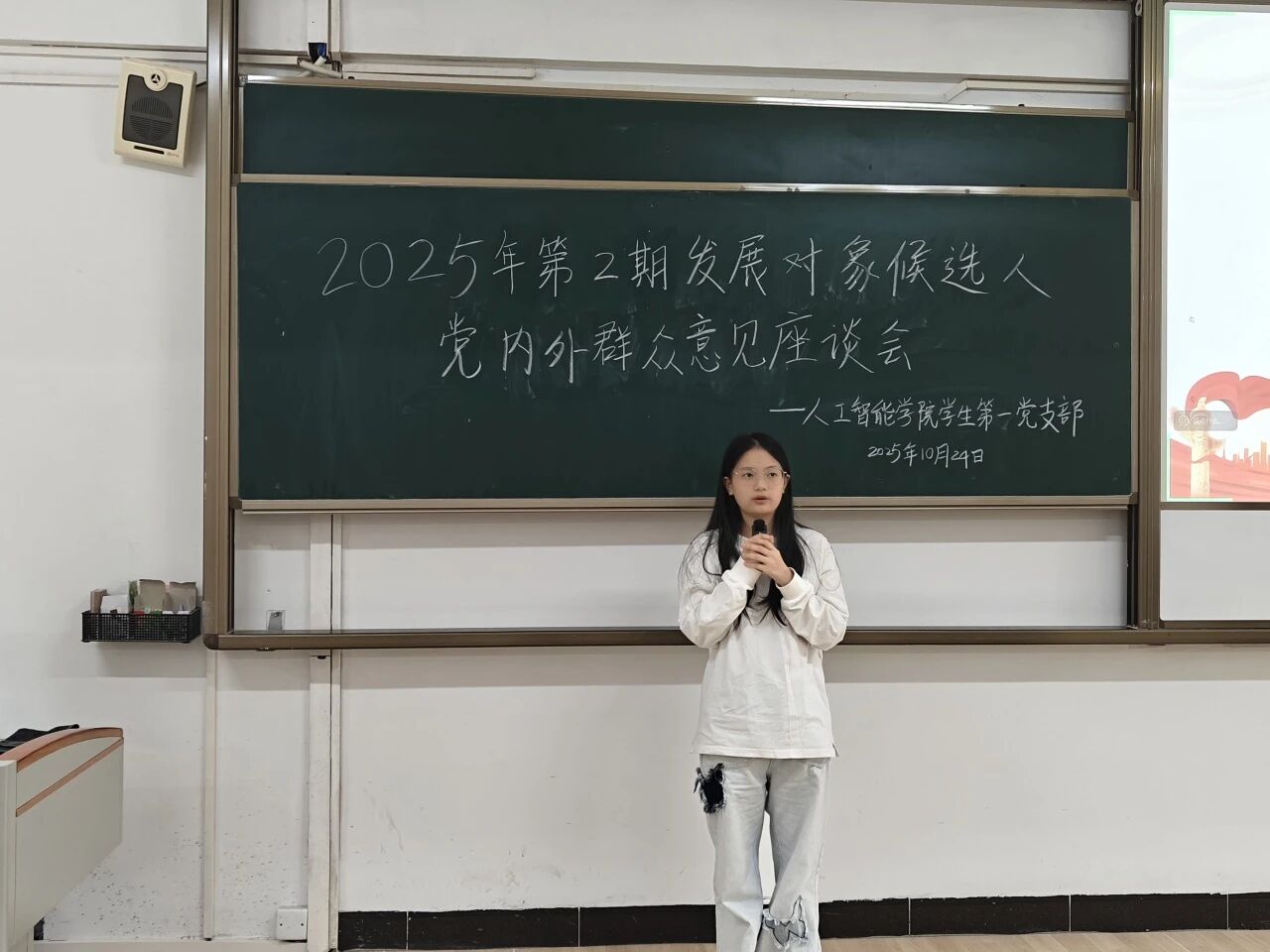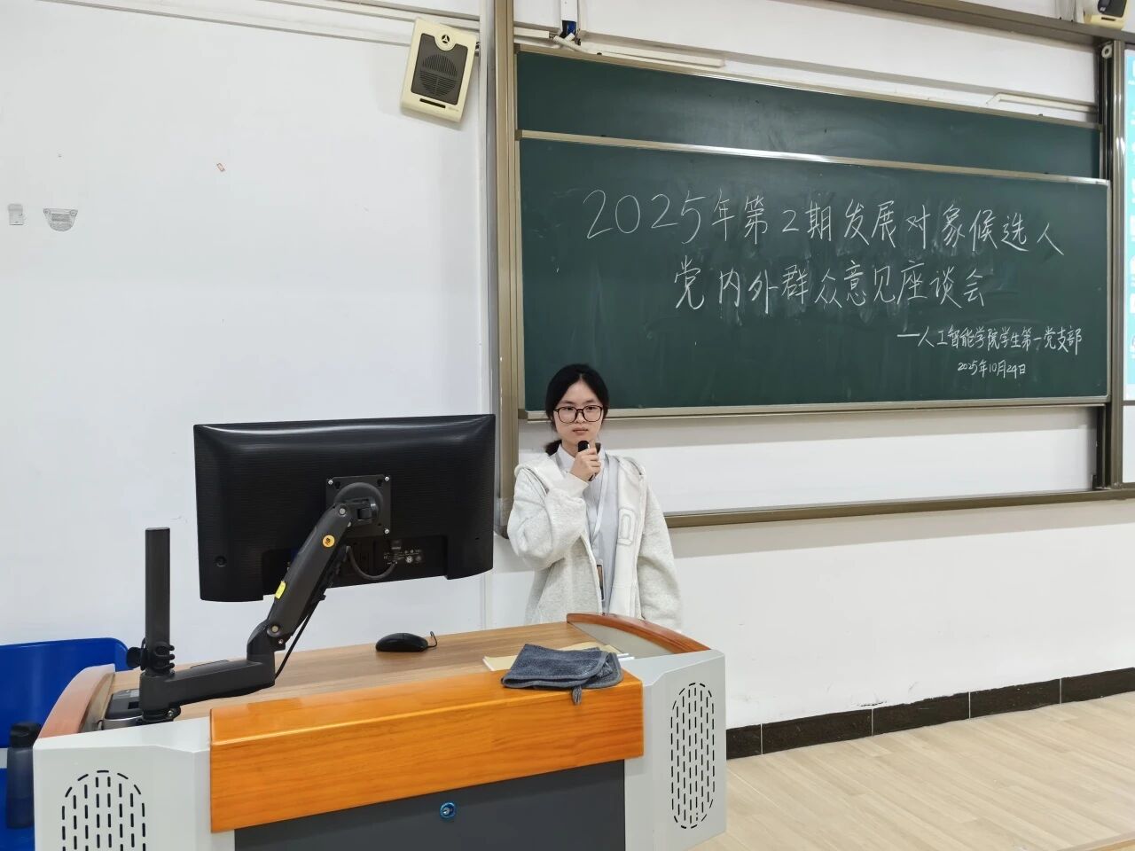 10月24日下午,人工智能学院学生第一党支部于6栋214教室召开2025年第2期发展对象候选人党内外群众意见座谈会。全体党员、发展对象候选人和学生党支部工作人员准时参会。会议开始,主持人详细介绍了会议流程及座谈会的目的和意义。随后,发展对象候选人逐一登台,围绕思想提升、学业进展、实践经历等方面展开汇报,着重说明自身入党动机、对党的认识以及服务群众的具体做法。