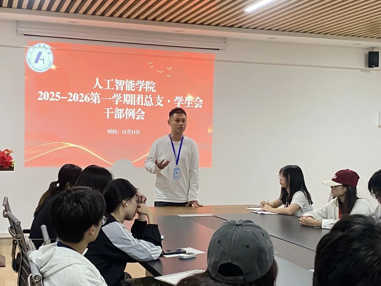 为全面梳理近期工作成效、清晰规划后续发展方向、进一步增强团队凝聚力与工作效能,人工智能学院团总支・学生会于11月11日晚在5栋301会议室顺利召开2025-2026第一学期部门例会。本次会议由团学执行主席吴烜鸿负责主持,团总支书记黎鑫然、主席团及各部门副部全员参会,共同参与这场集思广益、谋划发展的工作会议。