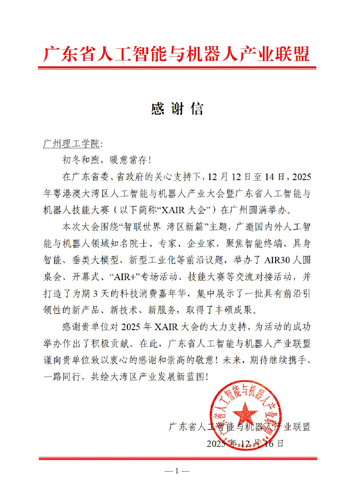 初冬暖阳映初心,聚力同行启新程。XAIR 大会圆满落幕,广州理工学院获广东省人工智能与机器人产业联盟感谢信。