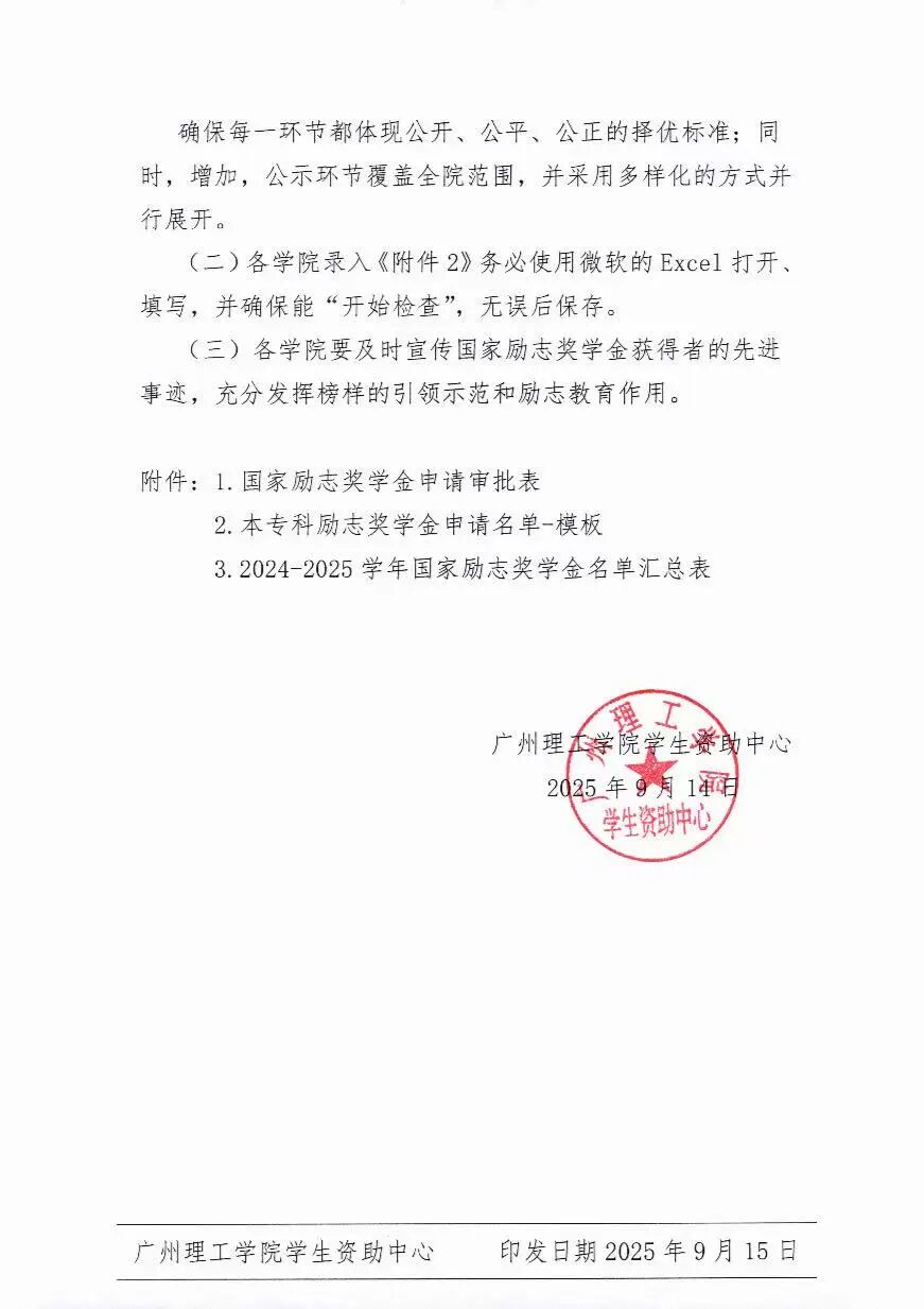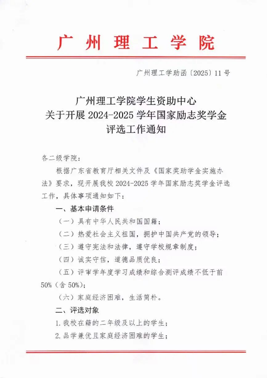 广州理工学院学生资助中心 关于开展 2024-2025学年 国家励志奖学金评选 工作通知