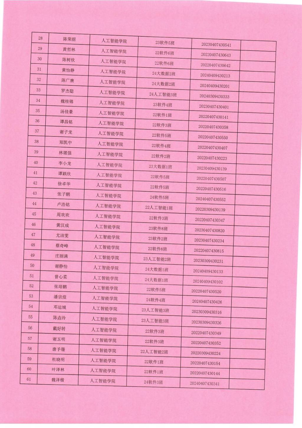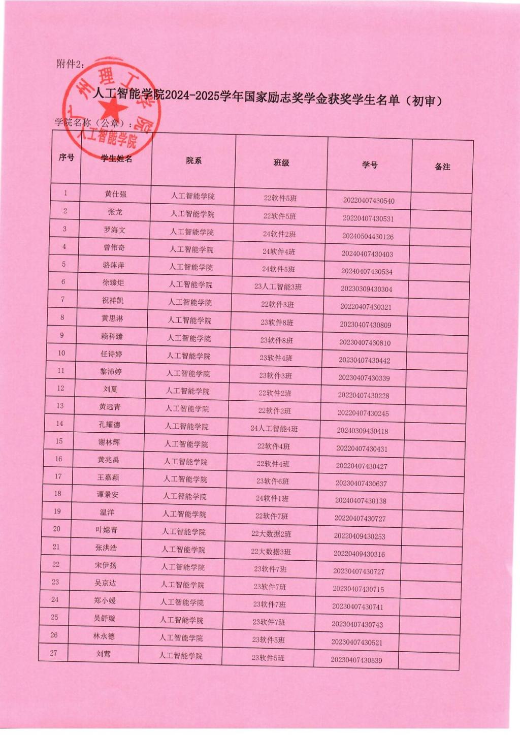 根据我校《2024-2025学年国家励志奖学金评比工作方案》通知(〔2025〕11号)文件的要求,人工智能学院经过严格审核,现对2024-2025学年国家励志奖学金拟推荐名单进行公示,此公示名单仅为学院评定,最终名单请以学校公示为准。