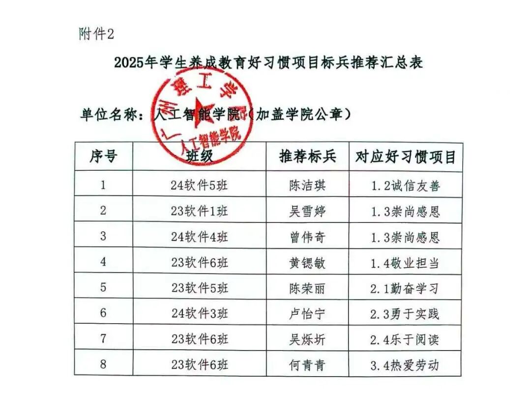 根据广州理工学函〔2025〕164号关于开展2025年春季学期学生养成教育“好习惯标兵”评选活动的通知,人工智能学院本着公平公正公开原则对收到的申请材料进行严格评选,现对学院2025年春季学期学生养成教育“好习惯标兵”评选活动拟推荐名单予以公示。公示时间从2025年10月10日至2025年10月12日。