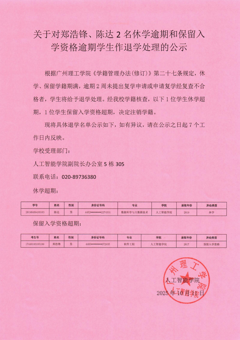 关于对郑浩锋、陈达2名休学逾期和保留入学资格逾期学生作退学处理的公示